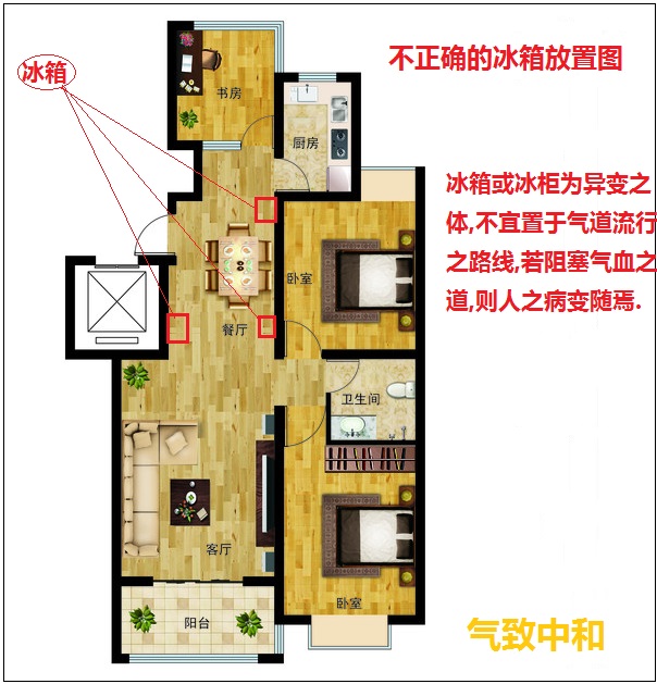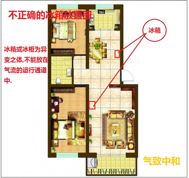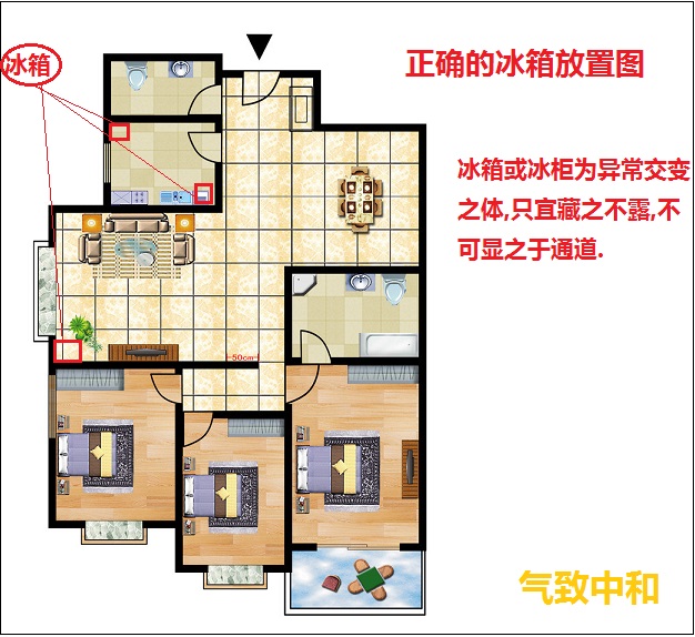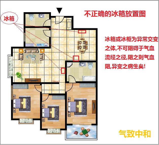 (2),“避”是指迴避。住宅犹如人体,人有口嘴求食,有鼻孔呼吸;宅有向前采光,户门纳气;人之食物入体有喉道与胃肠,呼吸入体亦有气管与肺区;宅有向口采光入厅而得阳,又有户门纳气而顺道散布八方。人体讲究经络气血通、肠胃通等;住宅讲究气口畅、走道畅等;总之,通畅就是健康的原则基础,若哪方不通畅,则哪方有病痛。而对于家居风水中的冰箱来讲,一是有固定的形体,二是一个异常的变动源,所以这种东西就要迴避气道位置或走道位置。在我的考察实例中,凡冰箱安放于气道口,或气道流行路线中间的,近则一两年,远则十年内,就会在人体的相应部位产生息肉、结节、肿块、硬核、肿瘤等病态,大家可根据四象理论找出住宅与人体的对应部位。所以,冰箱的安放要避开气口、以及气道的路径。