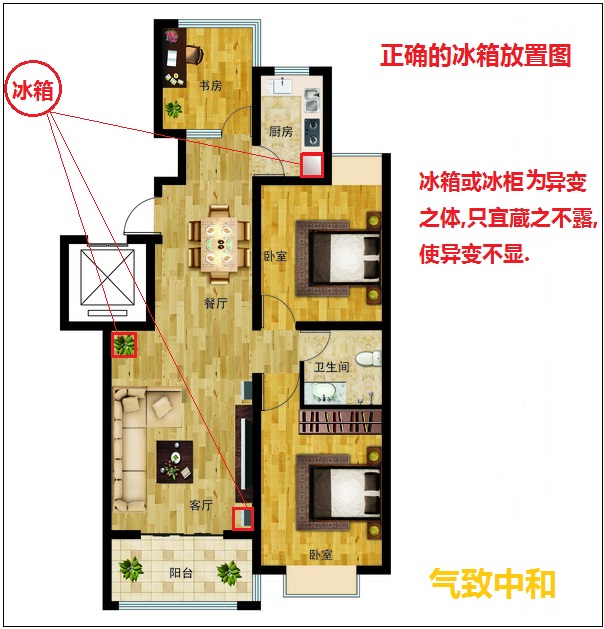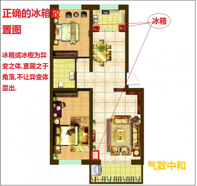 (1),“藏”是指隐藏。住宅就是藏人的地方,而各房间就是隐藏家具物品的所在。房间之成,皆因四墙围而使气聚,墙与墙之间又构成角落,角落之处气静寂而不动,而这静寂不动正是收藏异变体的最佳位置。冰箱为异变之体,异变常年而动;角落为墙合之地,寂然而静;易理之学,以静制动;冰箱为变异之体,为病拙之态,今以角落内藏之,又是藏拙的一种体现。所以,冰箱的安放宜置于两墙相合的墙角内,此称为“藏”。