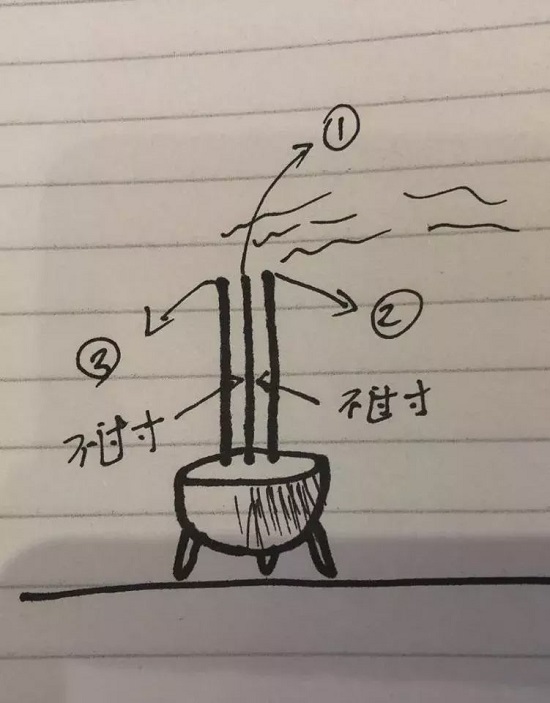 三炷香插平插直,为什么要插平,因为代表你心平气和,为什么插直,代表你心地正直,上面几点,需心静如水方能做到。