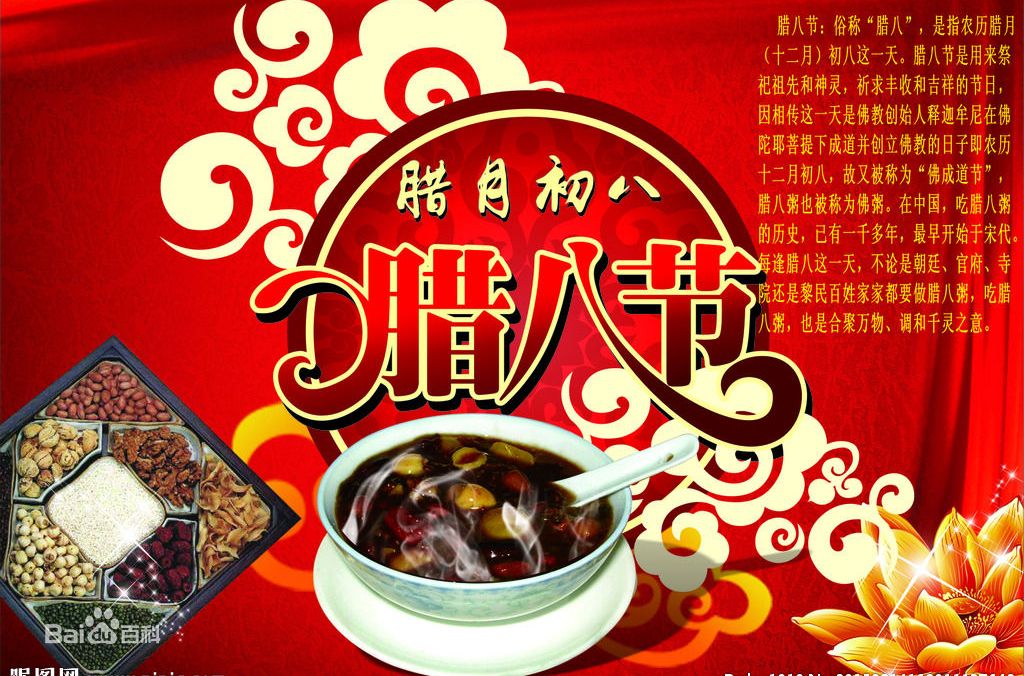 腊八节,节期在每年农历十二月初八,主要习俗是“喝腊八粥”。腊八节是佛教盛大的节日之一。佛教的创始者释迦牟尼,在腊月初八,夜睹明星而悟道成佛。十二月初八这天是佛祖释迦牟尼成道之日,又称“法宝节”、“佛成道节”、“成道会”等。古印度人为了不忘佛祖成道以前所受的苦难,也为了纪念佛祖在腊月初八悟道成佛,便在腊月初八这天以吃杂拌粥作为纪念。自从佛教传入中国,各寺院都用香谷和果实做成粥来赠送给门徒和善男信女们。腊八这天,各寺院举行法会,效法佛陀成道前牧女献乳糜的典故,用香谷和果实等煮粥供佛,名为腊八粥。传说喝了这种粥以后,就可以得到佛祖的保佑,因此,腊八粥也叫“福寿粥”、“福德粥”、和“佛粥”。“腊八”本为佛教节日,后经历代演变,逐渐成为家喻户晓的民间节日。