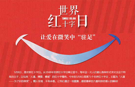 值此世界红十字红新月日,我们号召所有红十字会和红新月会的成员,保卫生命健康,捍卫人类尊严,齐心协力,众志成城,携手为人道!