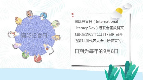 国际扫盲日(International Literacy Day)是联合国教科文组织在1965年11月17日所召开的第14届代表大会上所设立的。日期为每年的9月8日,旨在动员世界各国以及相关国际机构重视文盲现象,与文盲现象作斗争,并促进世界各国普及初等教育,提高初等教育的水平,使适龄儿童都能上学,达到能够识字的目标。最终达到增进人际沟通,消除歧视,促进文化传播和社会发展的目标。