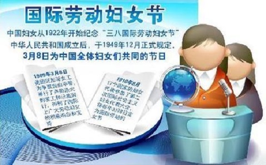 1949年12月,中国中央人民政府政务院规定每年的3月8日为国际妇女节。根据中国国务院发布的《全国年节及纪念日放假办法》(国务院令第270号)第三条规定:妇女节(3月8日)属于部分公民放假的节日及纪念日,妇女放假半天。