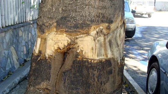 有人曾经在委内瑞拉首都加拉加斯拍到了一幕“虐树”事件:一棵长在马路边缘、侵占了人行道位置的大树被剥掉了大半圈树皮。这样做其实是不得已而为之,因为这种树身上遍布圆锥形的小尖刺,如果不加以处理,靠近它的行人很容易被刺伤,甚至还有中毒的危险。