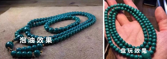 其实对于文玩老鸟来说,绿松石接触多了,一眼就能分辨出来,因为泡过油之后的松石,颜色跟正常盘玩包浆玉化的松石颜色是不一样的。