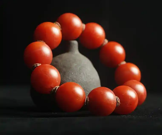 看气泡:注胶南红比较容易辨别,注胶南红在其外层有一层存在小气泡的透明包裹体,用放大镜会观察到内部有细丝状的透明线纹。