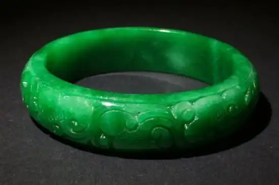 干青料的颜色主要以绿色为主,包括黄绿色、墨绿色和深绿色等。它的绿色浓度很大,看上去饱和度很高,但透明度较差,往往呈现出一种干涩的感觉。同时,干青料中常有黑点出现,并且常常伴有裂纹,使得其整体品质受到影响。