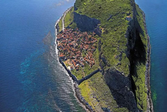 在希腊海岸线边的莫奈姆瓦夏岛(Monemvasia),有一个小村庄隐藏在巨型岩石背后,居民们坐拥壮观美景而与世隔绝。公元前375年,小岛因一次地震与大陆分离,后来,小岛与大陆之间建造了一条可以任意来往的走道。