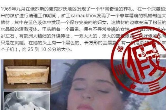 在网络上能够找到的新闻中都使用了这样一张古棺和小女孩的图片,新闻声称科学家经过碳同位素检测发现是这个小女孩竟然诞生于8亿年前,这一度使得人们开始质疑人类进化论是否正确,图片上这位女孩的皮肤雪白,看起来是一位13岁左右的白人女孩。