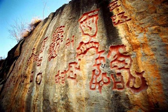 在距黄果树瀑布约7公里的红崖山的半山上,有一块巨大的浅红色绝壁,壁长100米,高达30多米,在山峦的一片绿色中,格外耀眼夺目,好似镶嵌在碧绿地毯中的红宝石。石壁上有20余个深红色的形似古文的符号,似篆非篆,若隶非隶,非镌非刻,横不成列,竖不成行,大者如斗,小者如升,均透出一种古朴苍劲的韵味。