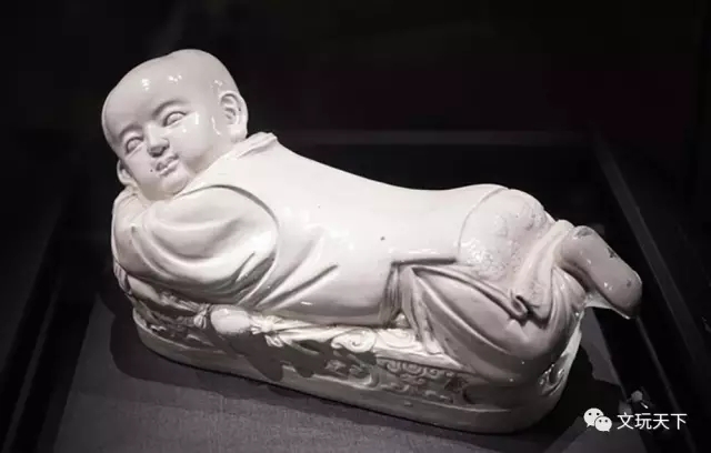 被咱们列为国宝的这件孩儿枕,本身具有很深的历史背景。它的做工精细,枕上的小孩儿双臂环抱,伏卧在木榻上,头侧垫在左臂上,右手拿个绣球,双脚交叉跷起,一副天真顽皮的神态,刻画的栩栩如生。它使用的是宋代名窑——定窑,白润的色调与质感,散发出一种自然雅致的艺术气息!
