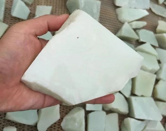 比如上面这块料子,这就是韩料,看着挺白,但却给人一种沉闷的感觉,缺乏玉应有的灵气。