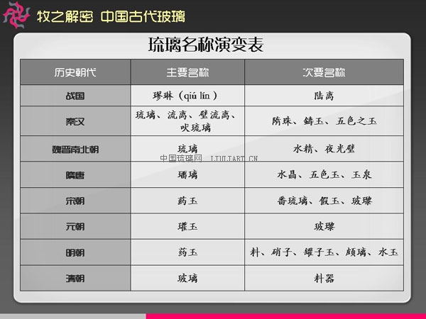 在中国古代的早期(高古时期),大多被称为琉璃。历朝典籍记载古代对玻璃的称呼一直在变,这反映了我国玻璃生产的兴衰,也反映了历史上对玻璃材质的认识与重视。战国的“璆琳、陆离”,汉代的“琉璃”,到宋元的“药玉、瓘玉、玻瓈”,再到明清的“硝子、料器、玻璃”,从名称上也可感受到形态、工艺的演变。