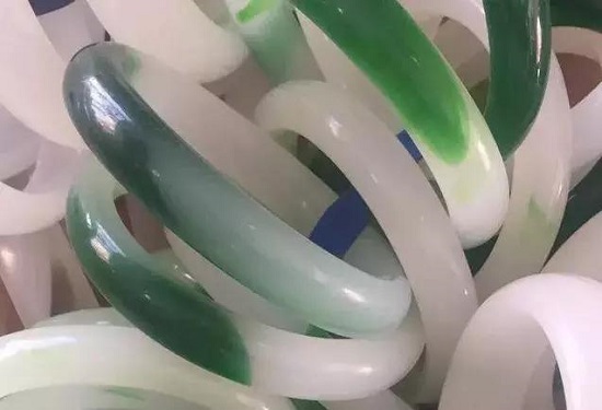 看起来翠色浓,白玉白,看断面并不像造假。可实际上,这就是一块染色伪装成翠青玉的料子。而下图的这些不到一百块就能买一只的青海翠青玉镯,基本上成本价也就是一半都不到!