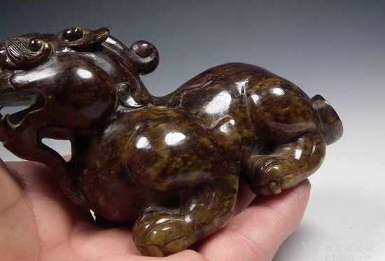 而作色是短期行为,它们不可能完全相像。出土的老提油,不少在皮壳处的颜色已经褪色、脱落,成为斑状,反而不如伸入玉肌内的颜色重,这种现象真正的沁色绝对没有。 另外,古玉虽然受沁,可古玉的皮壳其光泽、润色都一样。