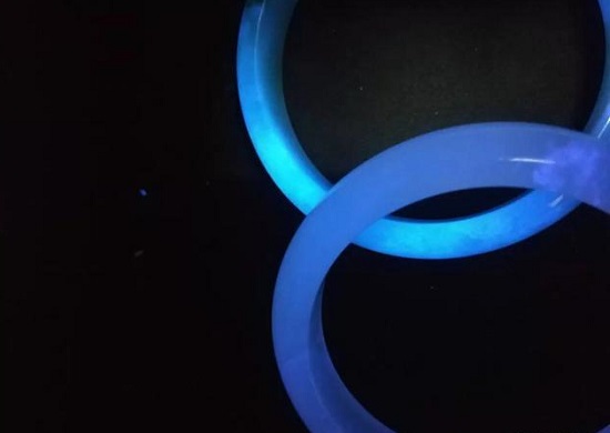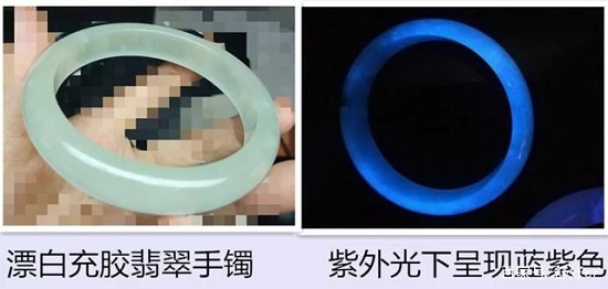 还有通过化学处理,人工强酸漂白后注胶的翡翠也会在紫外荧光下呈现蓝白色或者绿白色的荧光。