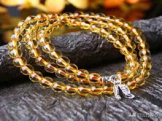 2、常见的人造黄水晶颜色均较黄,而且很多是大珠径圆珠(也有招财珠),其颜色黄的不自然,色泽暗淡,几乎感觉不到水晶的光泽,多数没有色差。
