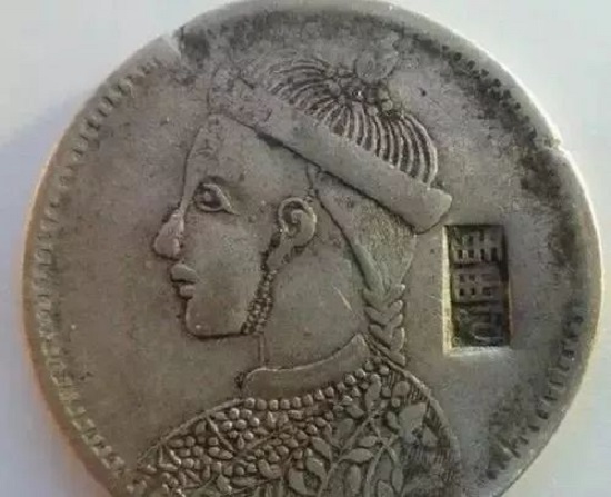 二是用冲凿具直接在银元上敲刻出的文字或纯印痕(如图。图片来自网络致谢)。对于第一种情形,这是相对理想的硬戳观感。第二种情形下又可大致区分为工整型与刺伤型两种。