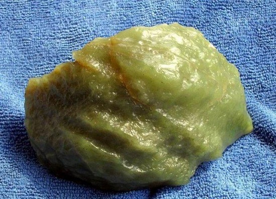 浸蜡:用无色蜡充填蛇纹石玉中的裂隙或缺口,以改善外观,一般较稳定,蜡状光泽,热针检测可有“出汗”现象。