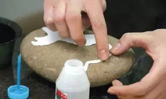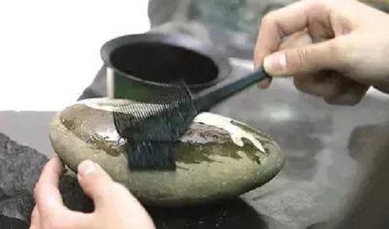 在石头外表涂上一层蜡,留出作画,然后用化学药品及常见的染发剂类浸染。