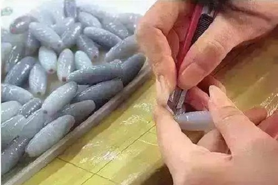 3、工人利用美工刀划出天珠上的纹路。
