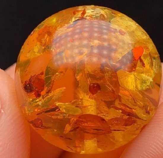爆红花常有两种途径:第一种是在炉子停止加热时直接放气,瞬时的压力释放和温压条件的综合作用会爆出红花。第二种是在爆出金花之后再回炉烤色,保留部分红色氧化皮的红花珀则是双色红花珀。从上图各位玩友应该还是可以看到个别金色的太阳花,是因为内部的爆花裂纹没有裂至琥珀表面,没有与空气中的氧气接触,所以还保持了金色的太阳光芒。