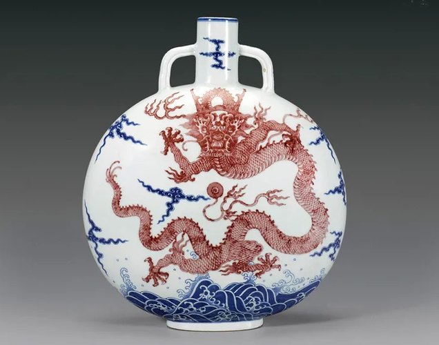 釉里红是以铜发色的釉下红彩,元代景德镇首创,特点是颜色有晕散,红色里经常出现绿色的斑点,叫美人醉。釉里红对窑温和气氛(窑内氧气浓度)的要求苛刻,元代把握不好,烧出的釉里红偏黑,许多都看不出红色来。但是我们窑工从来都不抛弃不放弃,到明朝宣德时,釉里红稳定了,然后又烧了三百年,到雍正皇帝时,唐英老爷终于做出了完美的釉里红。
