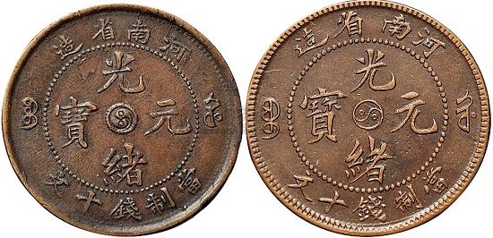 湖北省造光绪元宝,正面鲜然可见满汉文化的融合,而钱背却明确标示了西方文化的介入。此枚河南省造光绪元宝当制钱十文包浆入骨,锈色古旧,具有浓厚的历史韵味,是一枚难得一见的光绪元宝真品。钱币正面珠圈内铸有铭文“光绪元宝”四字,上下右左均匀分列,珠圈外上环铸楷体“河南省造”字样,下环铸钱币币值“当制钱十文”,中心为太极图案,左右两侧铸有钱局名称;钱币背面珠圈内铸有神龙腾飞图案,品相精致,审美风格独特,外圈铸有英文。此枚钱币是清代以龙图、太极图为钱币的主要图案,在当时是比较普遍的,几经流传,存世量已逐渐减少,故而,此币的收藏价值就愈发得珍贵。