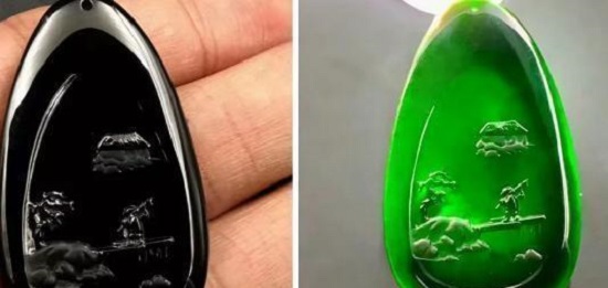 因而具有翠性,不过折射率和普通的翡翠一样,并不会因为太黑而影响折射。色调不一样虽然墨翠与乌鸡种翡翠的表面都是黑色,但是透过强光看就能看出明显不同,在强光透射下乌鸡种翡翠的色调几乎不变,只是稍淡一点,墨翠则会显出明显的绿色或蓝绿色。