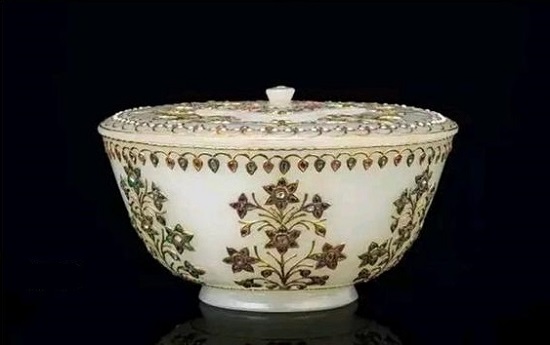 乾隆时期国运昌盛,和田、叶尔羌、伊朗、土耳其等地所进贡具有异域风格的痕都斯坦玉器,乾隆很是喜欢,因此也命工匠们仿制。据记载,乾隆为讨香妃欢心,不惜花费大量财力,在皇宫中复原西域贵族生活情境,首要陈设物就是痕都斯坦玉器。痕都斯坦玉器和中国玉器不同,多用纤细的金丝或银丝将花纹轮廓勾出,镶嵌各种玻璃、宝石等,或者是以西番莲和绍良花等植物为纹样的玉器,主要表现出器物的华丽。