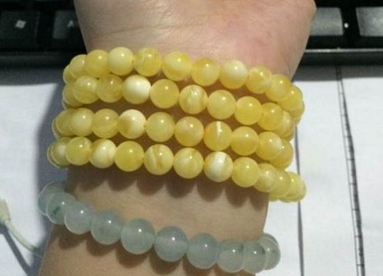 首先第一个,真正的蜜蜡,它含有一种乙醚油质,这种物质可以透过肌肤促进血液循环,具有滋润肌肤的作用。长期佩戴这种纯正的蜜蜡,也会让你散发迷人的气质,相得益彰,但是东西是好,切不可过度接触,比如晚上睡觉或者其他休息时间最好把实拍取下放好。