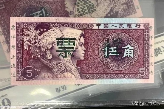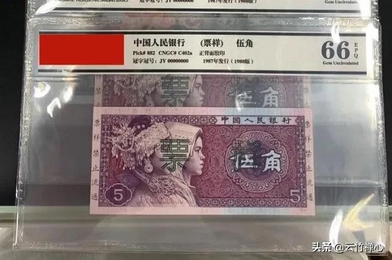 如图,这种币面印有"票样"两个汉字的五角纸币,因禁止流通而导致它出现在收藏市场上的几率极其稀少,也就意味着它的存世量寥寥无几,从而导致它收藏市场上价值不菲。