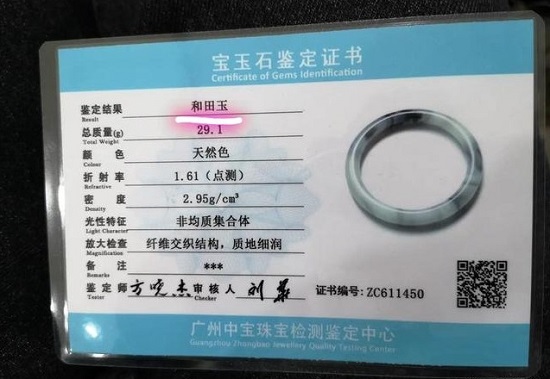 玉友买了条和田玉手镯,证书上写了“天然色”,为此怀疑是假的。其实鉴定证书上的鉴定结果是和田玉,说明就是和田玉,以下的数据是证明结果的依据。