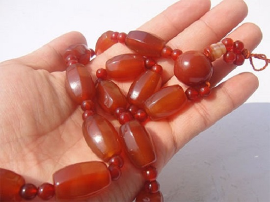 玉髓中红色的天然玉髓十分稀少,大部分红玉髓是勉强带点红色的,如巴西红白玉髓、印尼红黄玉髓等等。这种红玉髓是烤色玉髓,是人工处理成的红玉髓。烤色玉髓具有颜色鲜艳、红度高等特点,这些特点都优于天然红玉髓。然而,这些色彩毕竟是人工处理的,没有收藏价值,仅有装饰作用,因而价值很低。因此,如果您想选择既有收藏价值,又红色度高的饰物的话,不妨考虑红碧玺、南红玛瑙、红珊瑚等。