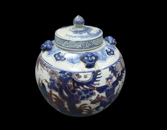 如图所示为一款青花釉里红瓷器,口径12cm,溜肩圆腹。青花纹饰,疏密有致。腹部描绘“鬼谷子下山”场景,画面饱满。鬼谷子端坐车中,神情淡然从容,运筹帷幄。青年将军手持战旗,上书“鬼谷”二字,大气磅礴。青山古松隐约其间,画面壮美。2005年佳士得的拍卖会上,有类似藏品以2.3亿元高价拍卖成交。五闲堂的该藏品,瓷质细腻,画面内容丰富饱满,线条流畅,亦是难得的精品。