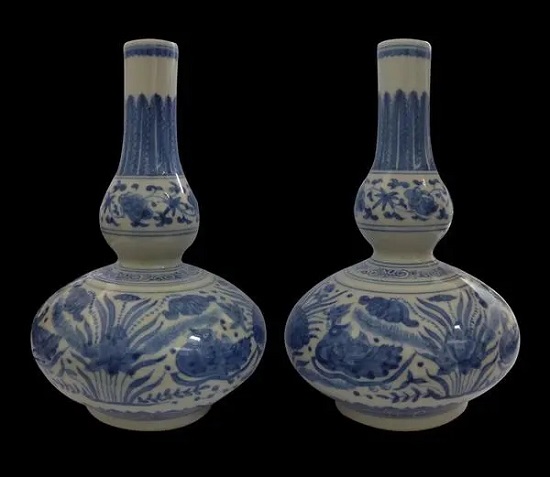 如图所示藏品为成化款青花葫芦瓶一对,造型新奇,雅观精致,底部”大明成化年制“落款。瓶呈葫芦式,小口,束腰,双球形腹,圈足。通体青花装饰,色泽淡雅柔和,主题图案为荷塘鸳鸯莲池嬉戏,线条勾勒流畅自然,画面内容丰富饱满。