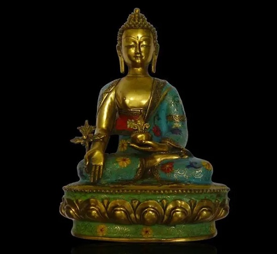如图所示藏品为景泰蓝佛像,高33cm,尊者面目慈祥,神态庄严,浅淡微笑,盘坐莲台, 让人心静、心净,仿佛俗世万千皆了然于胸。入眼可见尊者头戴五叶宝冠,发髻竖起,开脸清晰,双目暝神,长耳大垂,上有耳铛,座身饰有花纹。鎏金加身,珐琅填色,衣饰花纹,五彩斑斓。